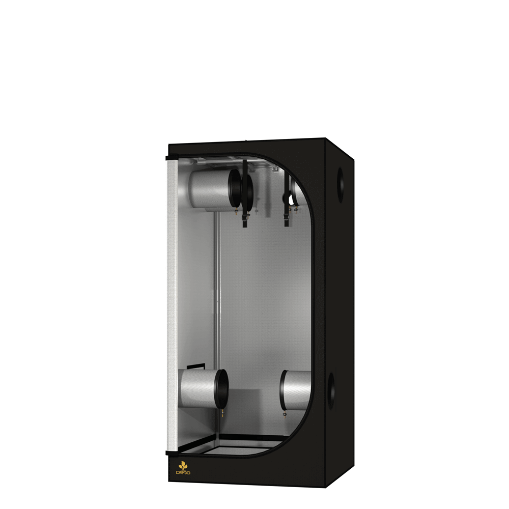 Der DR90 ist ein professionelles Growzelt mit einer quadratischen Grundfläche von 90x90cm. Mit einer Höhe von 200cm kann bereits eine HPS-Lampe installiert werden. Außen schwarz, ist es innen silberbeschichtet. Der DR90 hat einen zusätzlichen Einlegeboden, der mittels Klettverschluss an den Stangen befestigt wird.